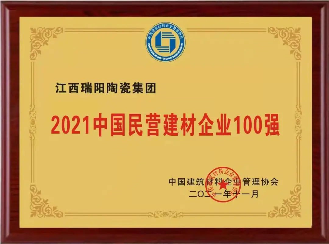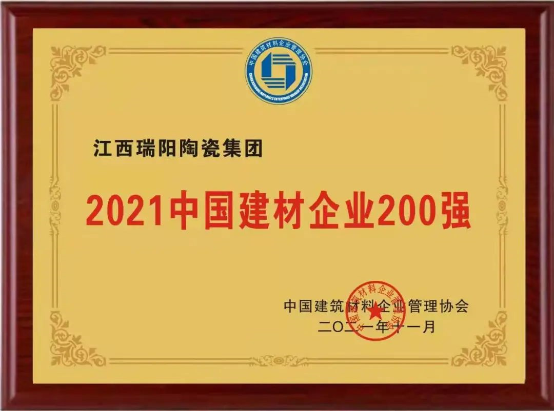 瑞阳陶瓷集团凭借雄厚的企业实力和良好的市场口碑,赢得一众专家评委的好评,先后荣获“2021中国建材企业200强”、“2021中国民营建材企业100强”两项大奖。从2014年的首次获选至今已连续8年登榜,瑞阳陶瓷集团收获的行业殊荣,充分彰显了瑞阳陶瓷集团在行业多变的竞争形势下所展现出的核心竞争力和强劲的发展实力。